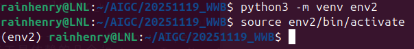 python3 –m venv en2source env2/bin/activate